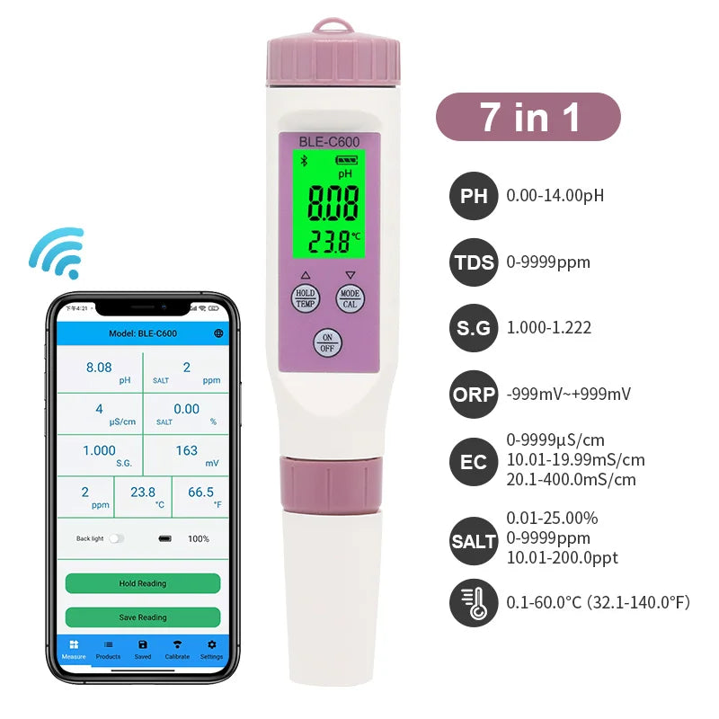 【7 in 1 analyzer Information Display】Simply immerse the pH meter sensor in the solution to be tested, readings are quickly displayed on a large LCD display. multi-parameter display at the same time, mobile phone APP control backlight display.