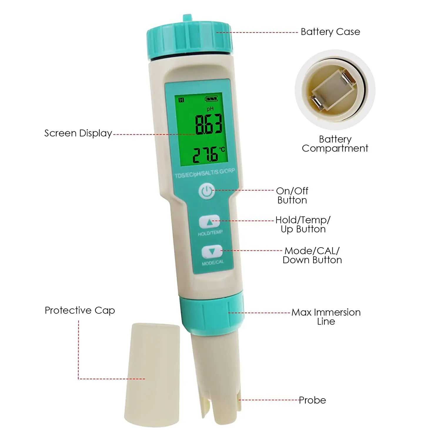 Measures PH,TDS,TEMP,EC,Salinity,SG,ORP.
