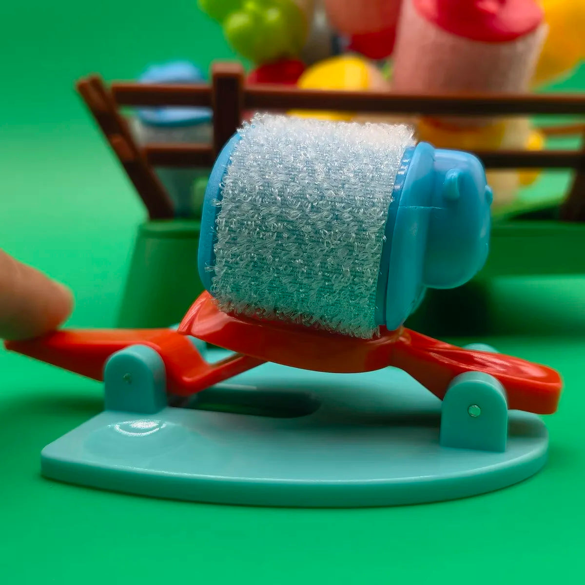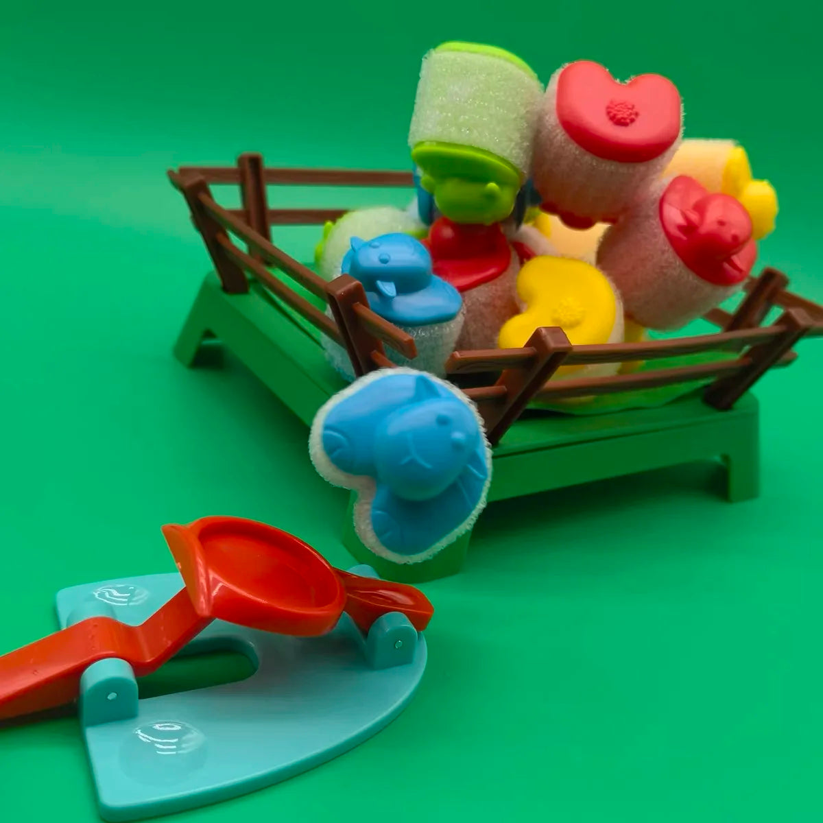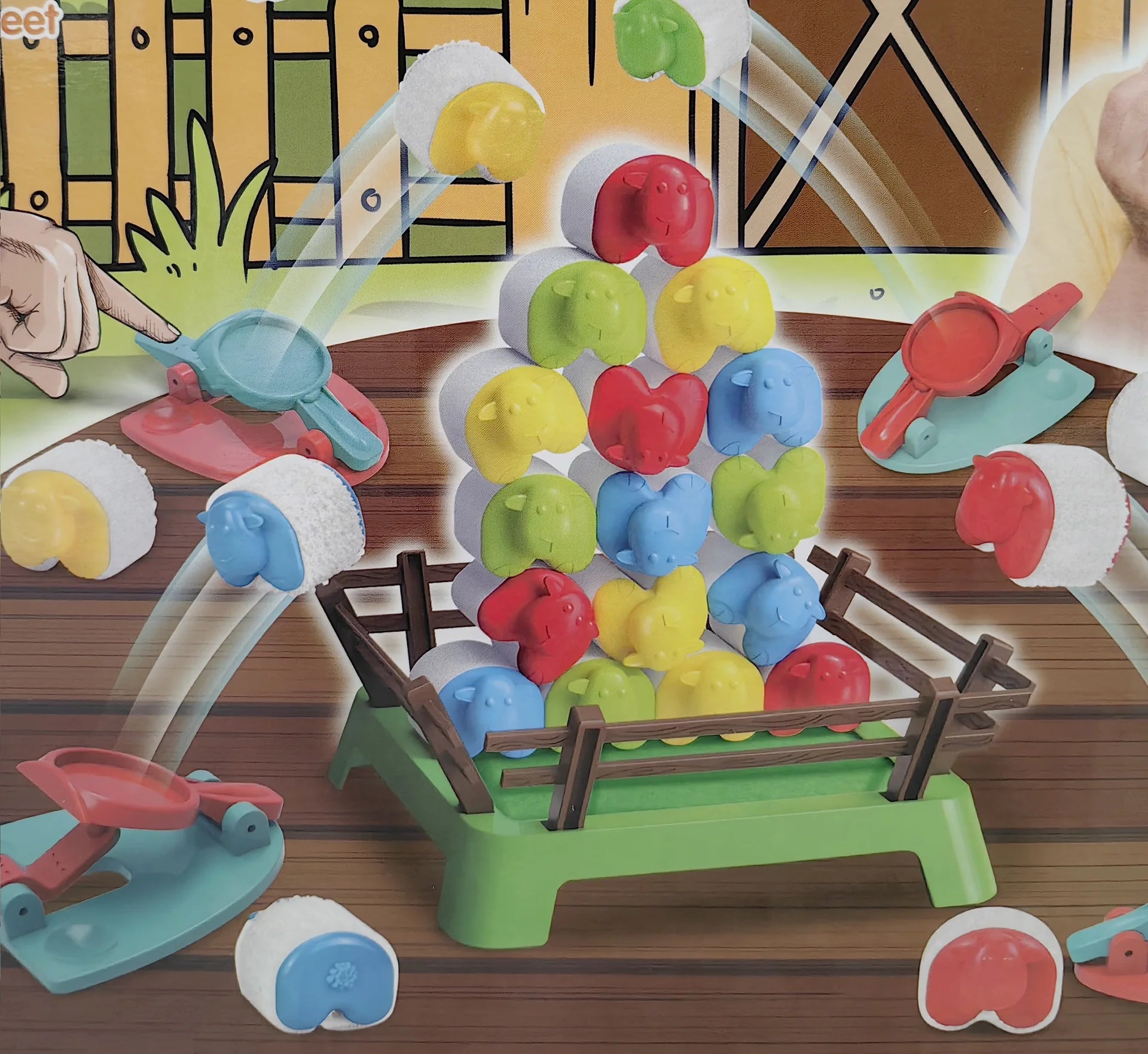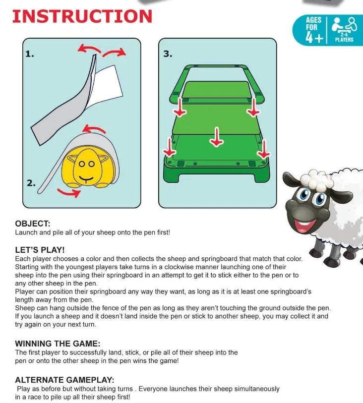 Each player chooses a color and then collects the sheep and springboard that match that color. Starting with the youngest players take turns in a clockwise manner launching one of their sheep into the pen using their springboard in an attempt to get it to stick either to the pen or to any other sheep in the pen.