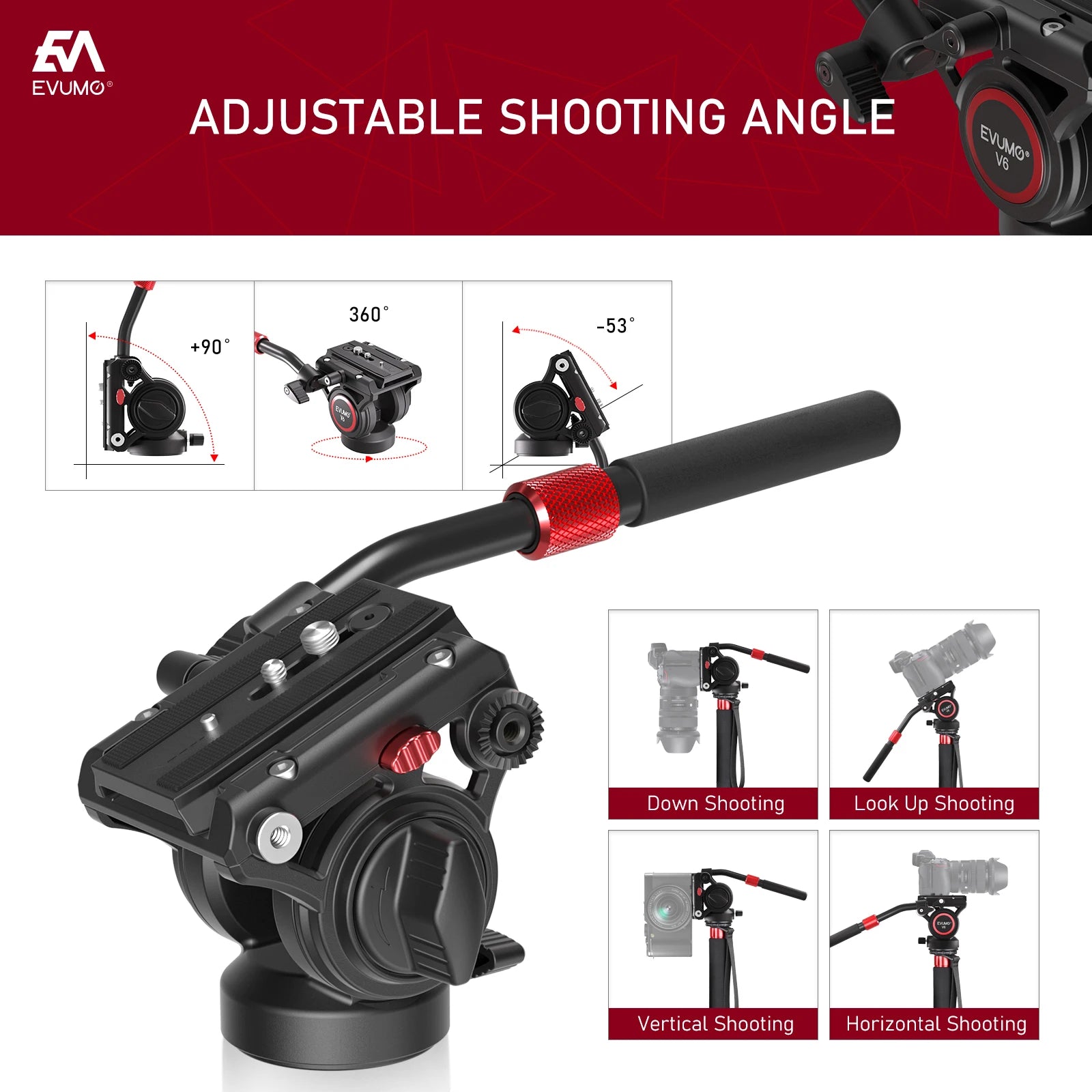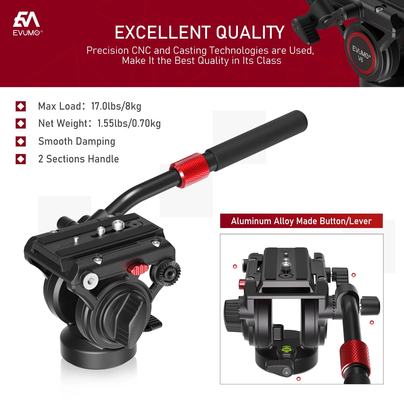 The EVUMO V6 fluid video tripod head is designed for smooth, controlled camera movement during video recording and photography. Built with a durable aluminium body, it features a fluid damping system that supports stable panning and tilting for precise framing. The panoramic head design allows consistent horizontal rotation, making it suitable for video shoots, interviews, live streaming, and professional content creation. With a load capacity of up to 8 kg, this tripod head is compatible with a wide range of DSLR, mirrorless, and video cameras. It can be mounted on both tripods and monopods, offering flexibility for different shooting setups. The included handle provides comfortable control and improved accuracy during operation.