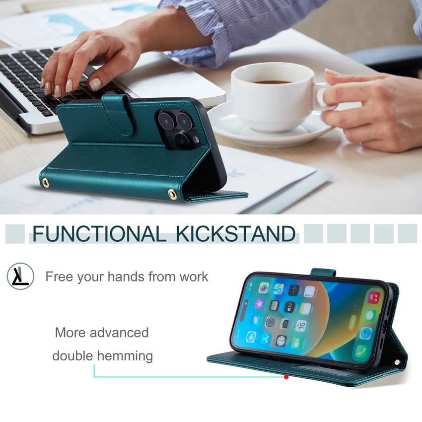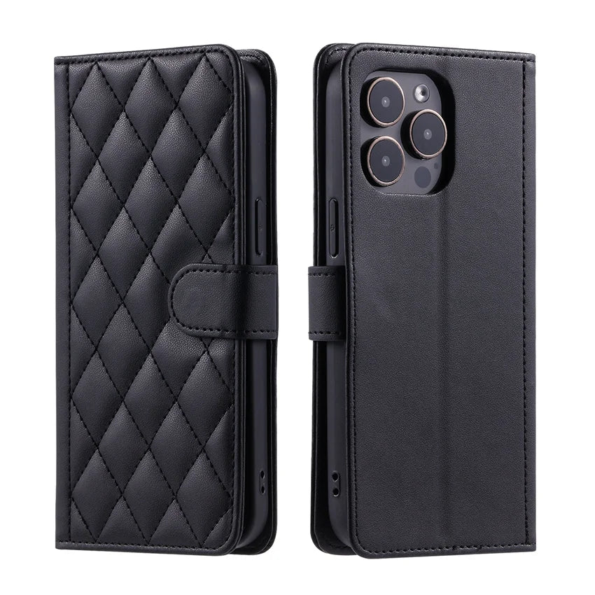 This wallet-style phone case combines a fold-over front cover with a structured protective shell for everyday use. The flip design allows the case to open into a viewing stand while keeping the screen covered when closed. The outer surface is finished in textured PU leather with a soft inner TPU shell that holds the phone securely. Card slots and an inner pocket allow the case to function as a compact wallet when carried on its own.