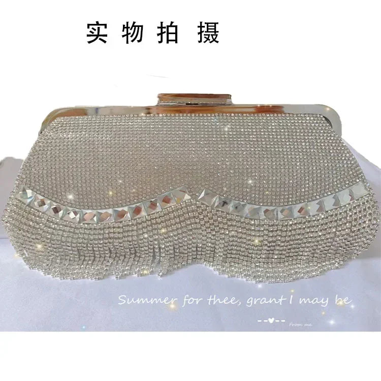 This rhinestone evening bag features a structured silhouette with a crystal-covered body and an elegant tassel handle that adds movement and light to every step. The compact hard-shell design keeps its shape while showcasing shimmering rhinestones that catch the light beautifully at evening events. Designed for formal occasions, it offers a refined balance between statement style and practical size. Ideal for weddings, cocktail parties, and special nights where accessories complete the look.