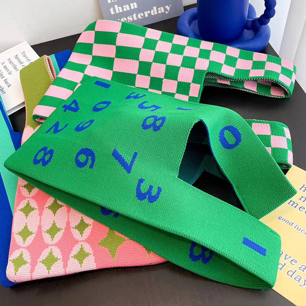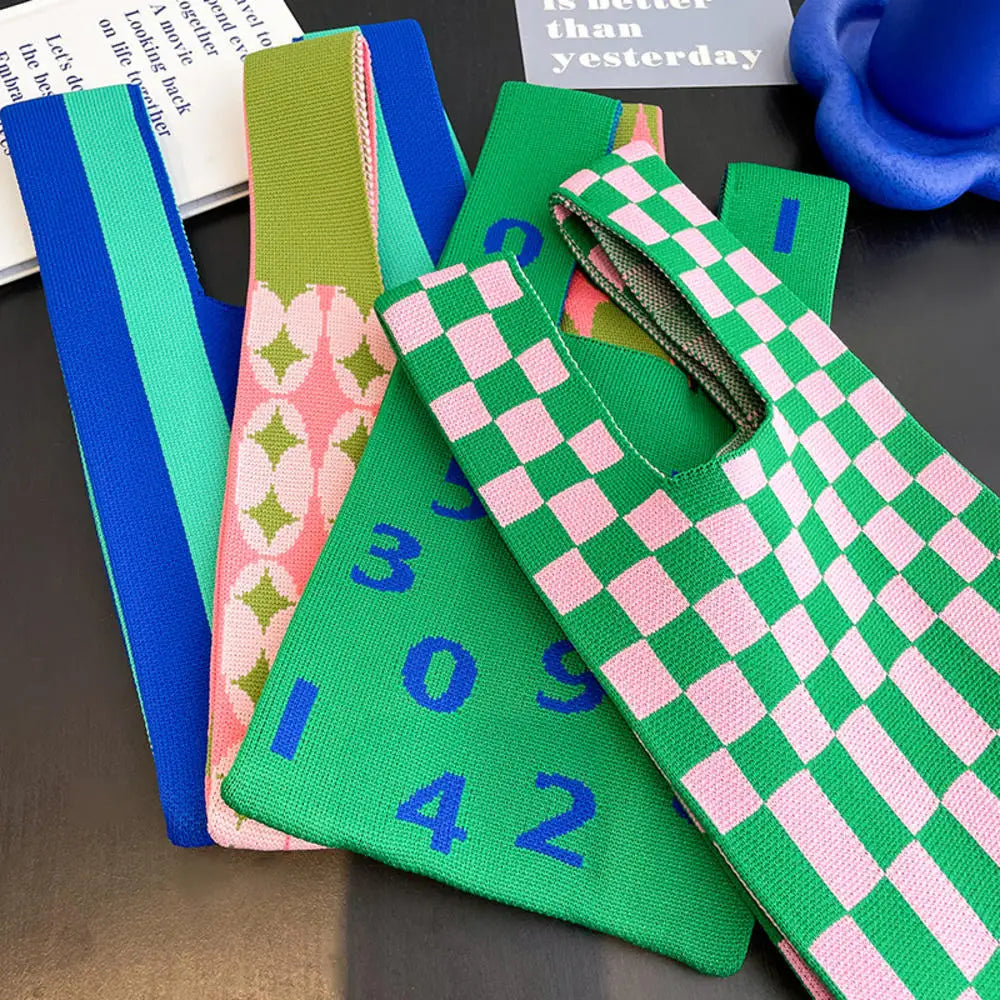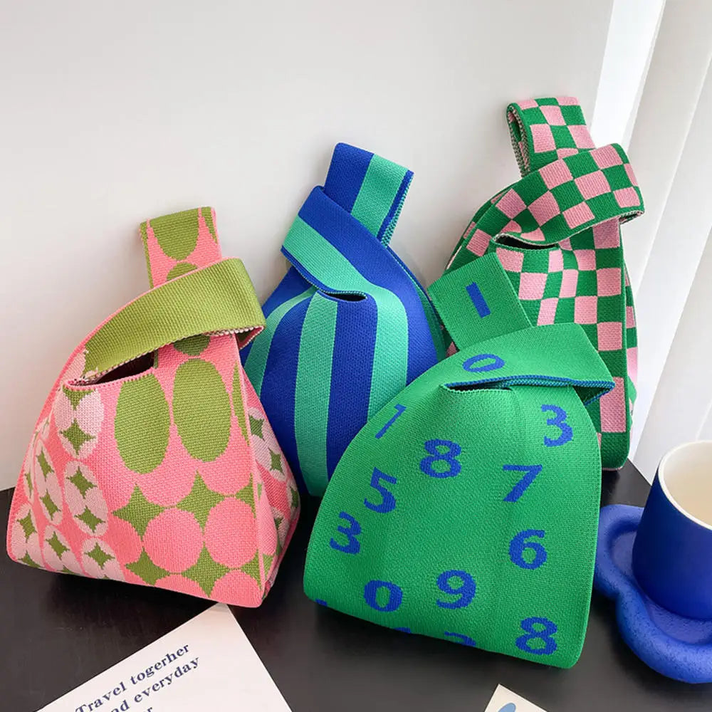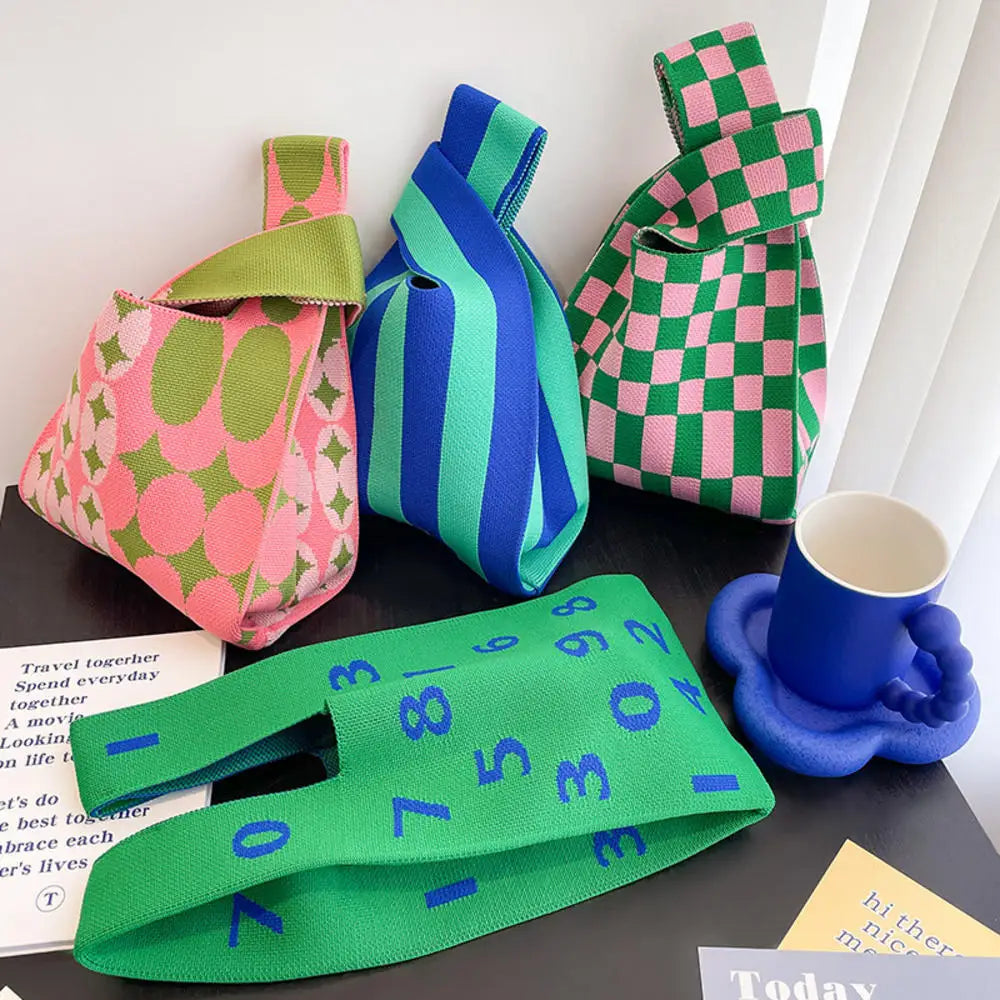 Handmade Knit Handbag Women Mini Knot Wrist Bag Korean Cat Casual Color Wide Stripe Plaid Tote Bag Student Reusable Shopping Bag