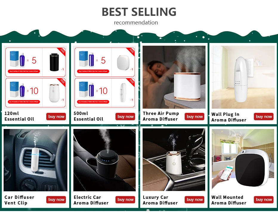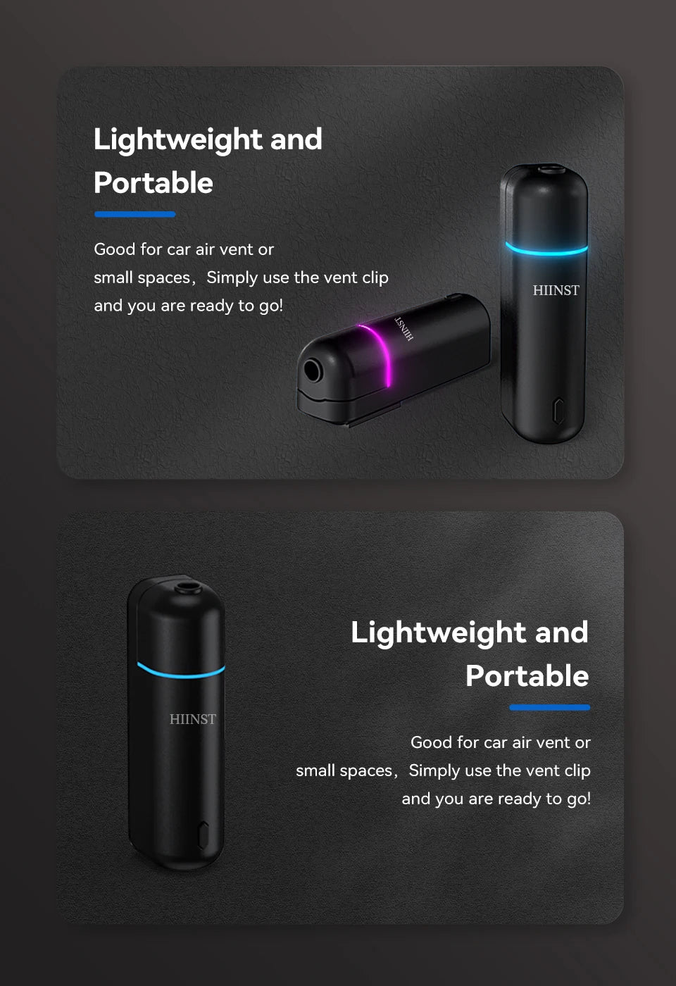 This car vent oil diffuser releases fragrance through a slim cylindrical unit that clips directly into the vehicle air vent. It uses airflow from the ventilation system to distribute scent evenly while driving without sprays or hanging elements. The diffuser features a smooth plastic body and operates via USB power while holding a small internal fragrance oil refill. Its vertical vent-mounted form keeps the interior clean, minimal, and discreet during everyday car use.