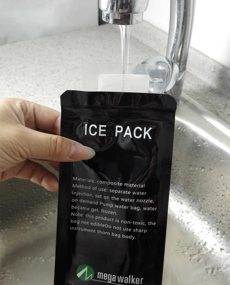 open the plastic gel bag and put the water into the plastic gel of 3/5 area(about 80ml water), then the sealing automatic closing.