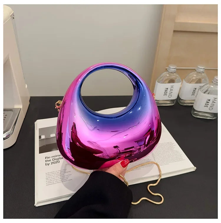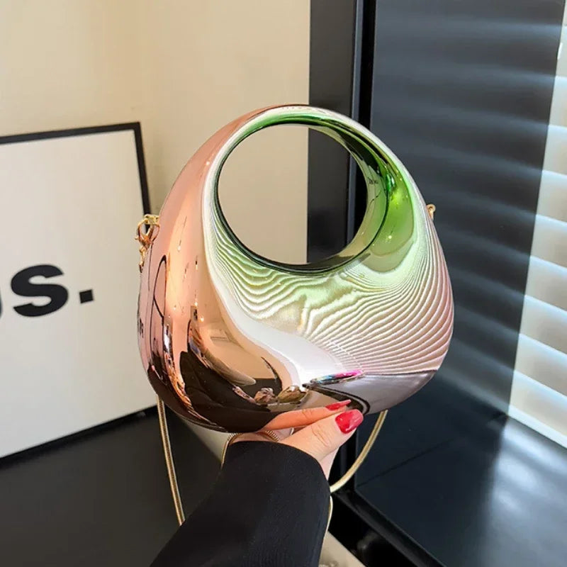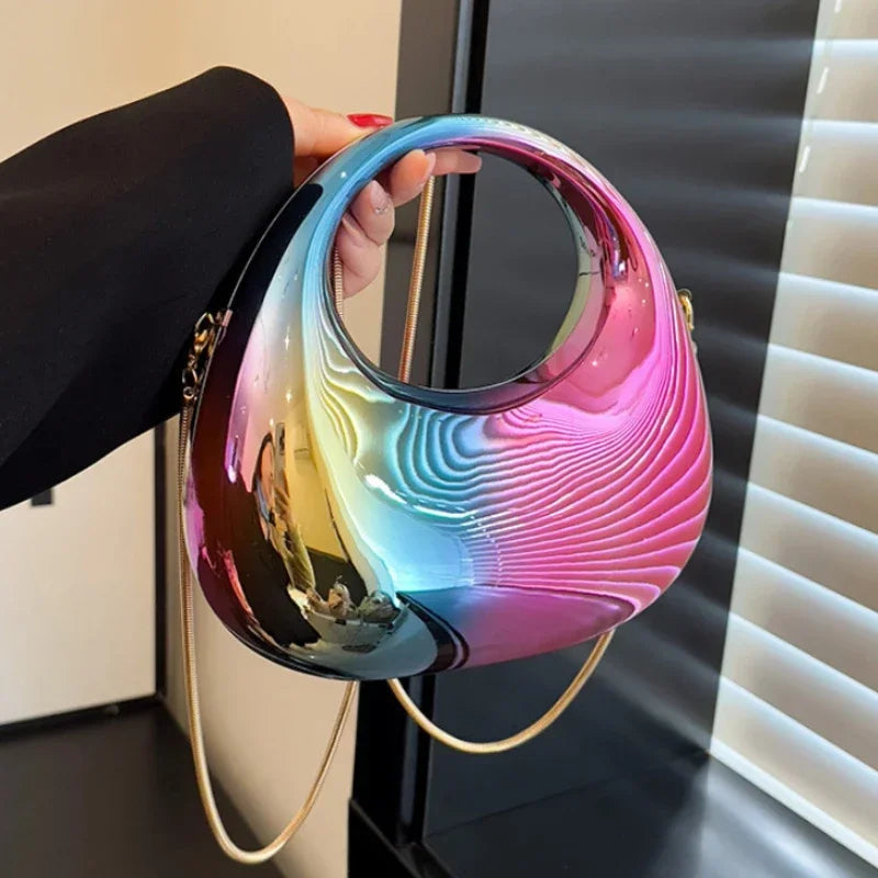 This half-moon evening clutch is crafted from smooth acrylic with a sculptural curved silhouette that reflects light beautifully. Designed for formal occasions and elegant nights out, it balances modern form with a refined, minimalist finish. The rigid structure keeps its shape while remaining comfortable to carry in hand or on the shoulder. Its compact interior fits your phone, cards, and evening essentials without bulk, making it ideal for weddings, cocktail parties, and special events. A statement accessory that elevates both classic dresses and contemporary looks.