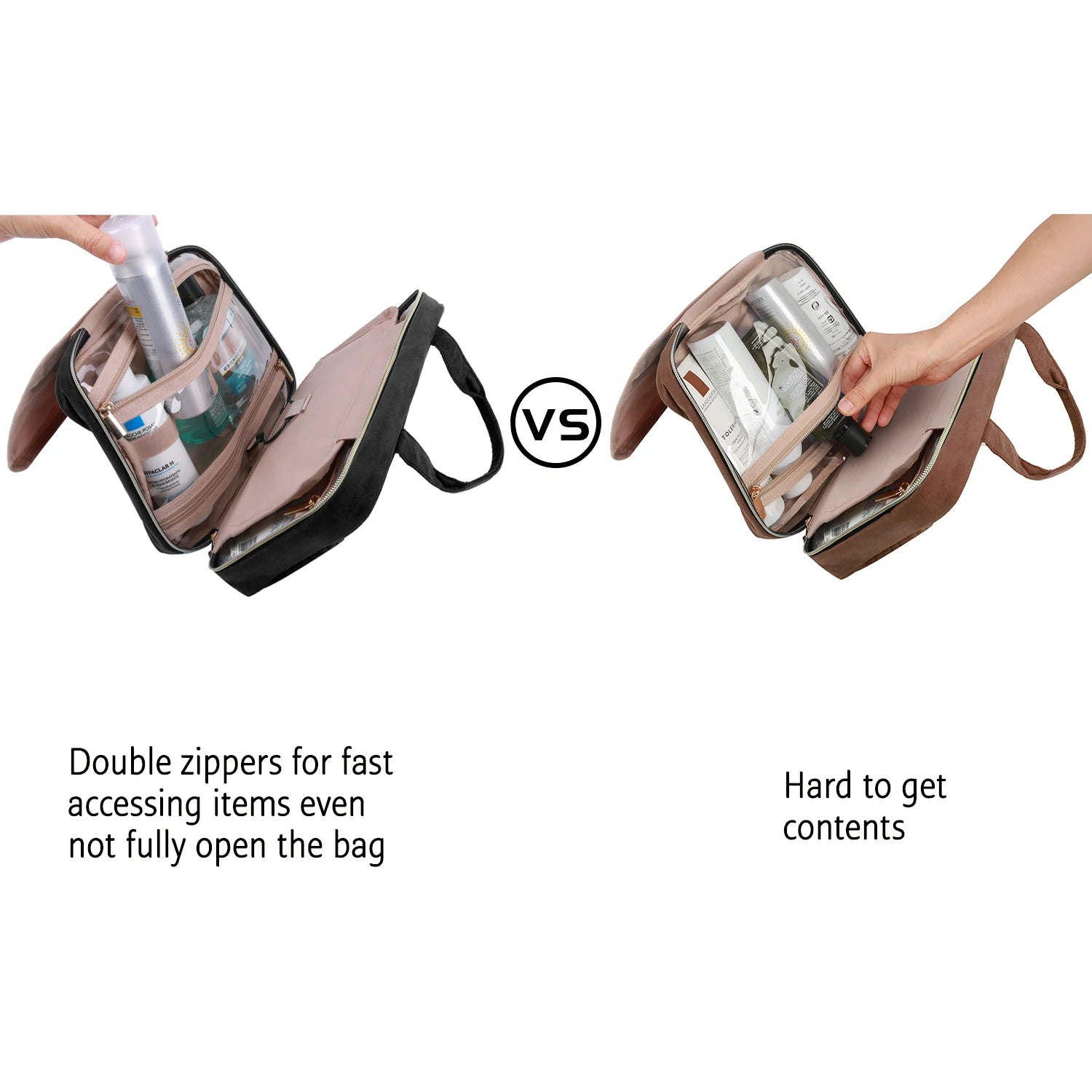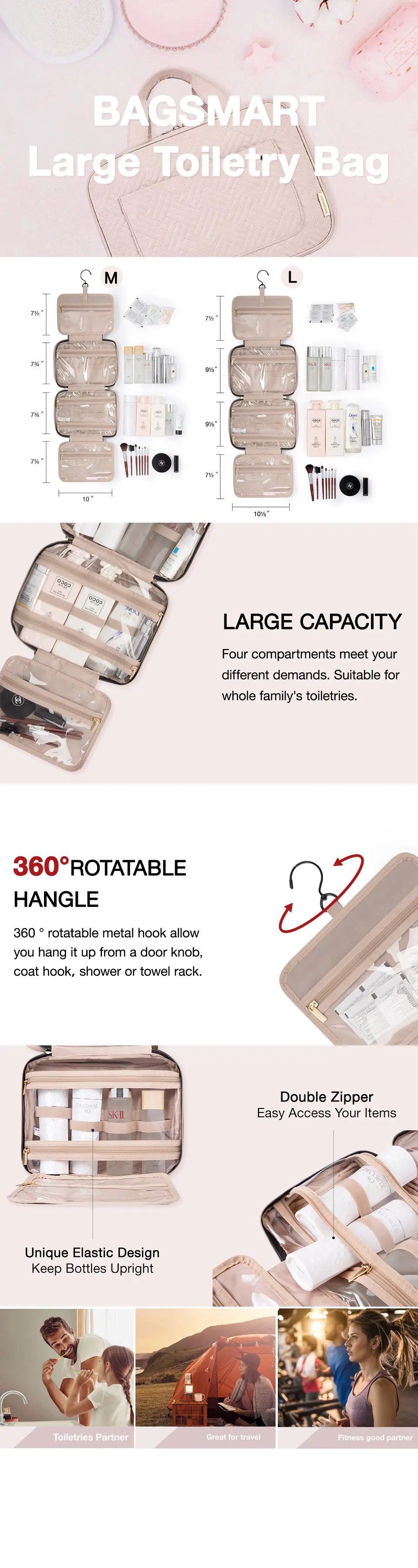 With 4 spacious compartments design, our toiletry bag would be your great partner whether you're going on a business trip for the next three months or visiting your parents for the next three nights. And its soft material, swivel hook, easy grab-and go handle, elastic strap system make you travel confidently knowing that your toiletries will be kept in their place.