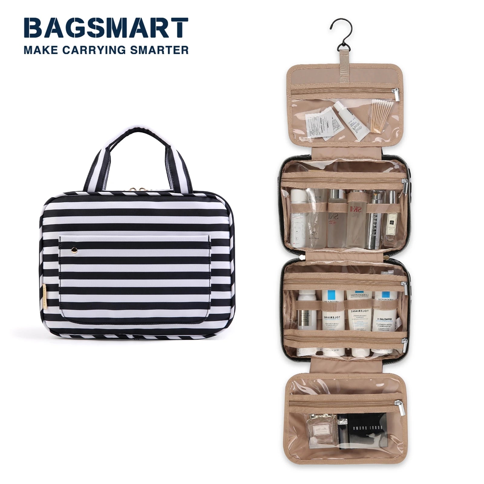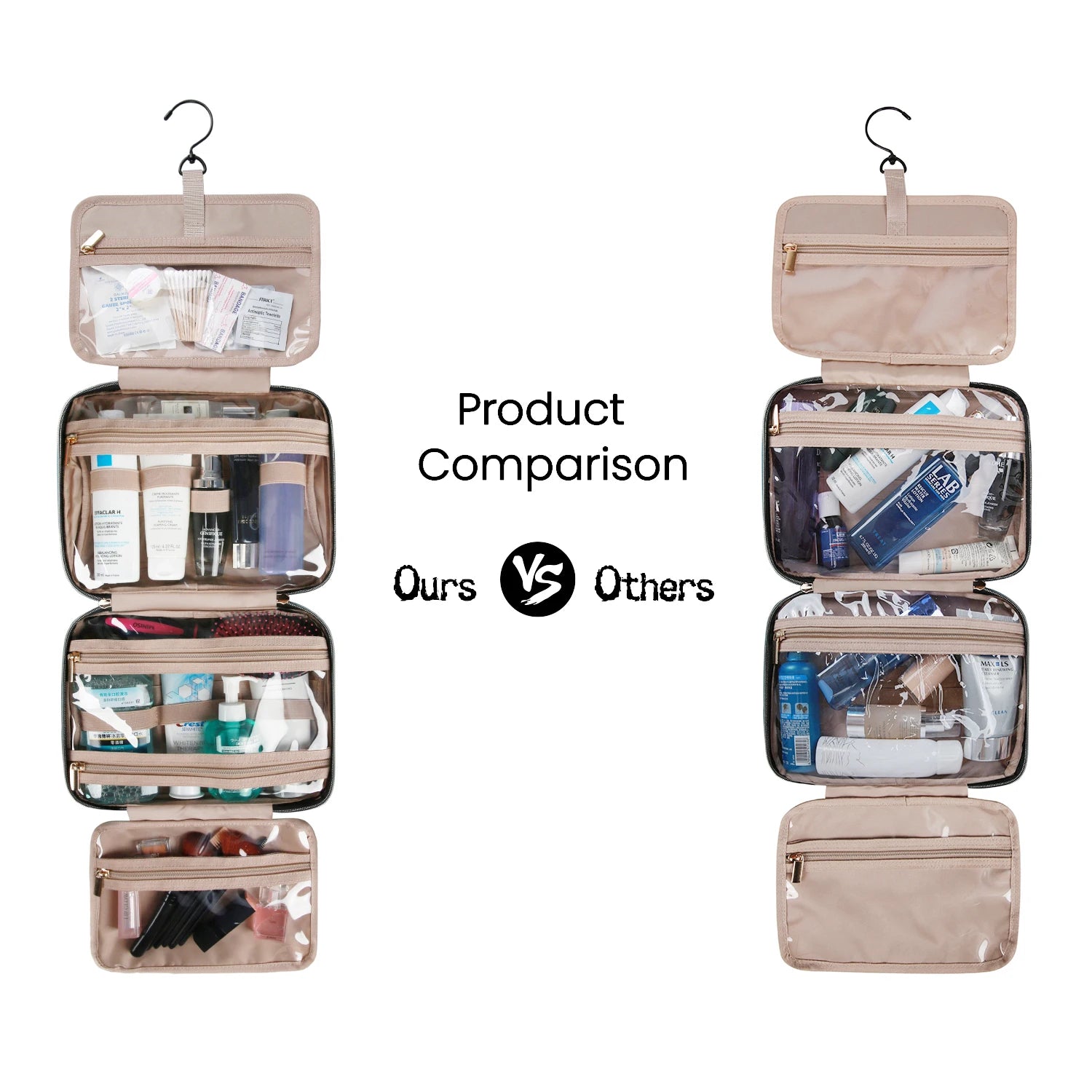 The toiletry bag lays flat on the counter, keeping germs away. No counter? Hang it up from a shower or towel rack with handy top hook, making it easy to view and access stored contents.