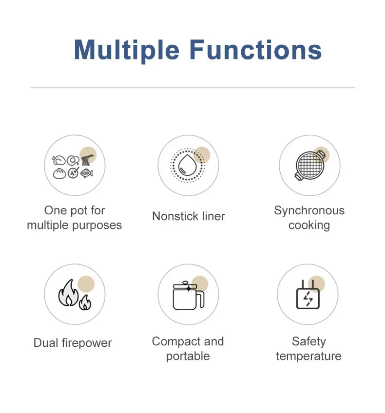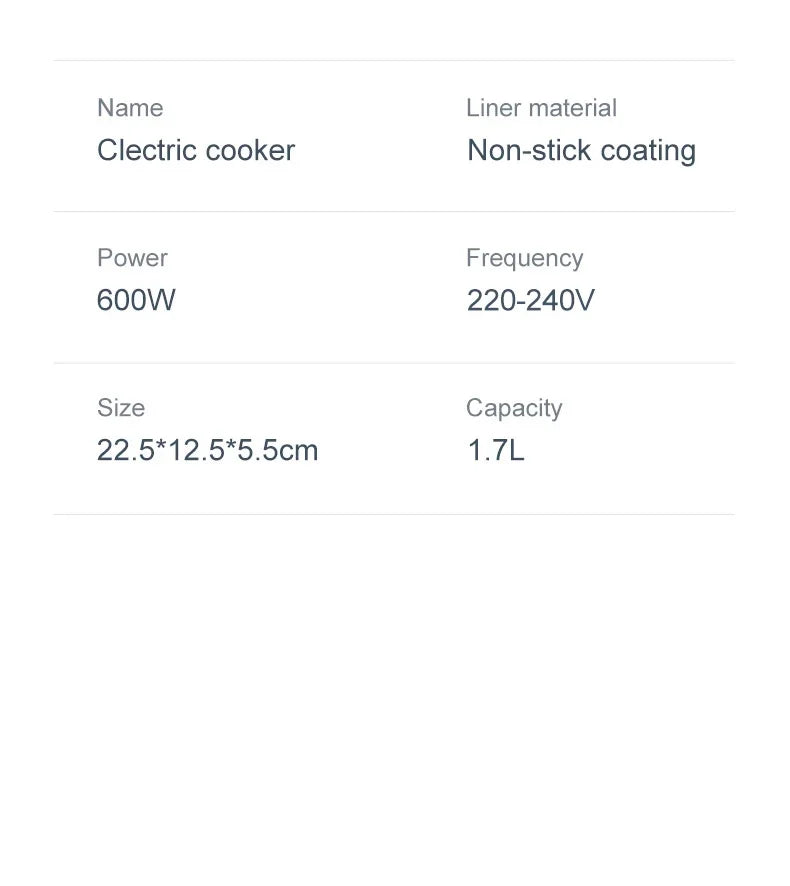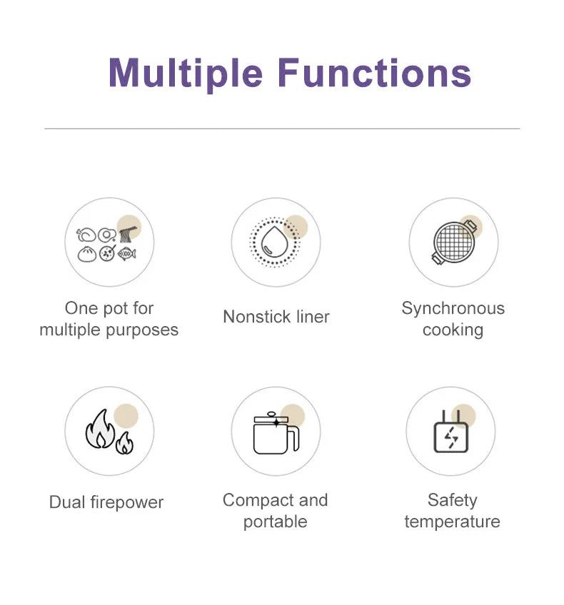 This mini rice cooker prepares small meals using a compact electric pot designed for everyday home use. It cooks rice, grains, and simple dishes while allowing simultaneous steaming through the upper layer insert. The cooker features a non-stick inner pot with an electric heating base for controlled, even cooking. Its space-saving form makes it suitable for small kitchens, dorms, offices, or single-portion meals.