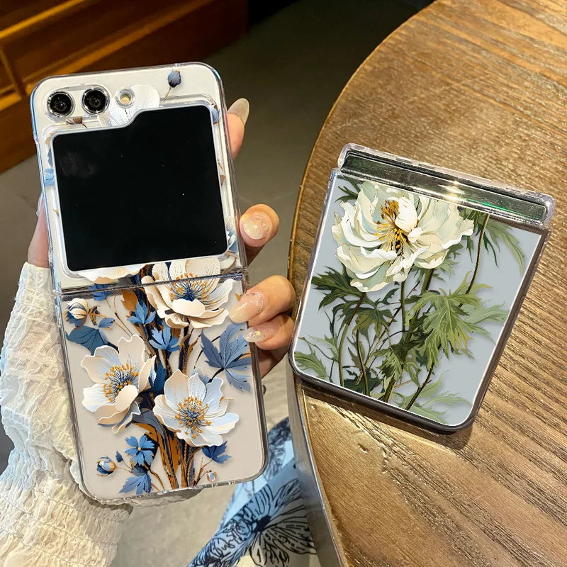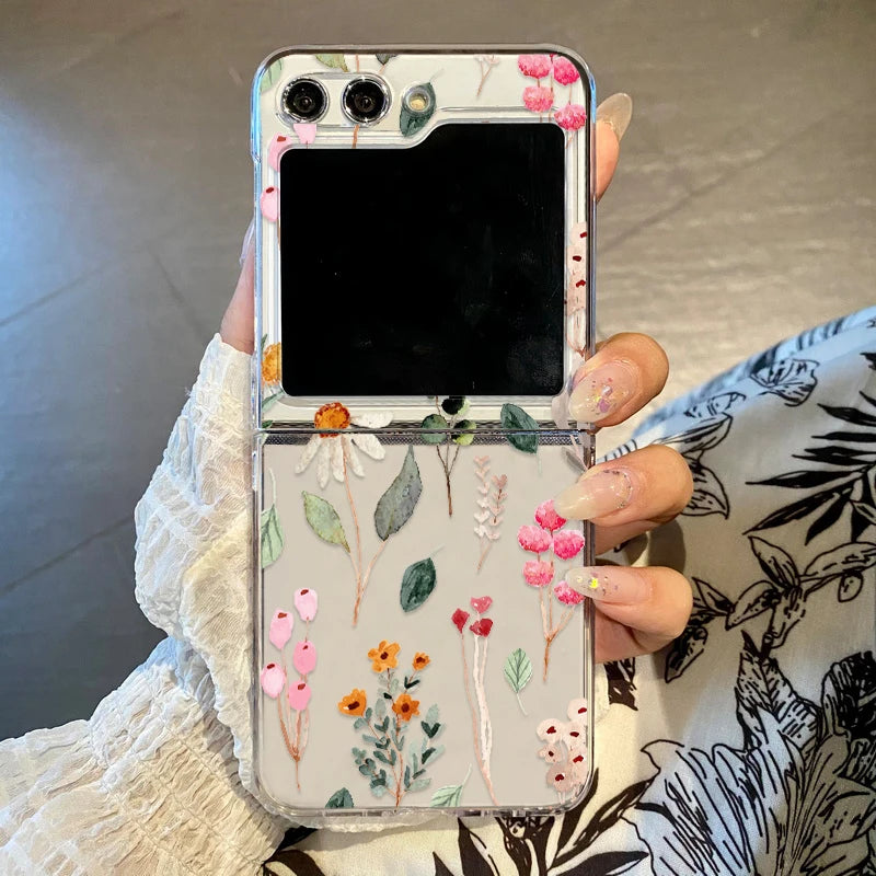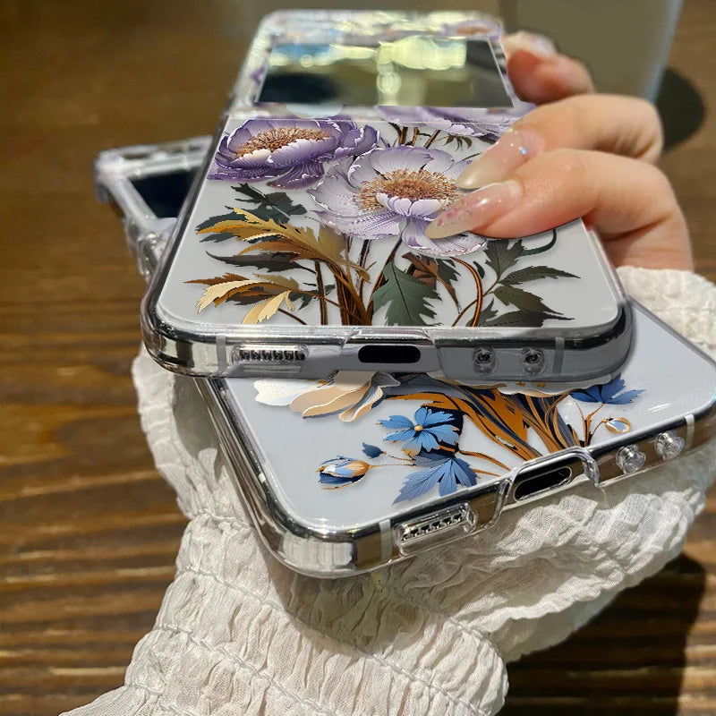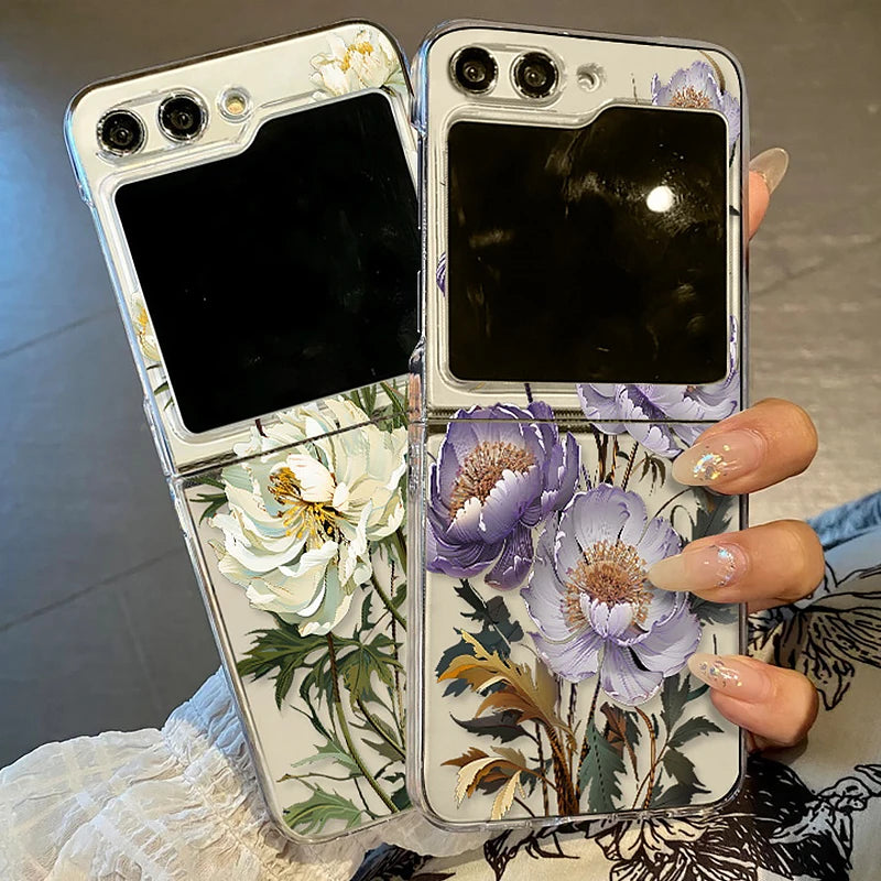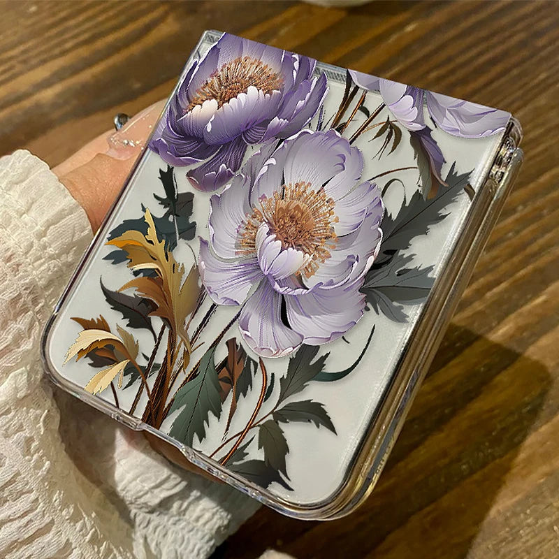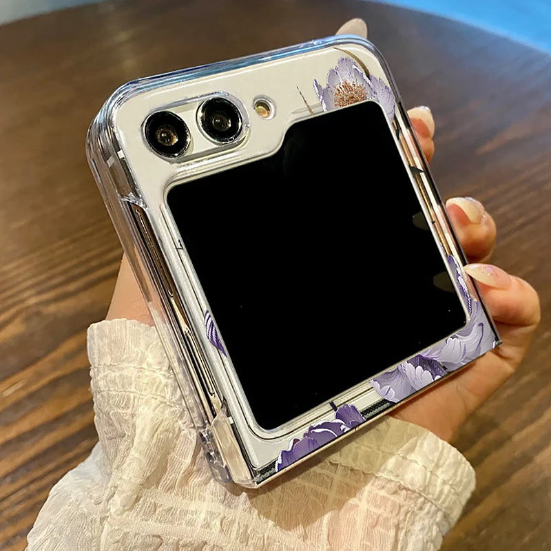 Purple Flower Pattern Phone Case For Samsung Galaxy Z Flip3 Flip4 Flip5 Transparent Hard Folding Cover For Samsung Z Flip 3 4 5